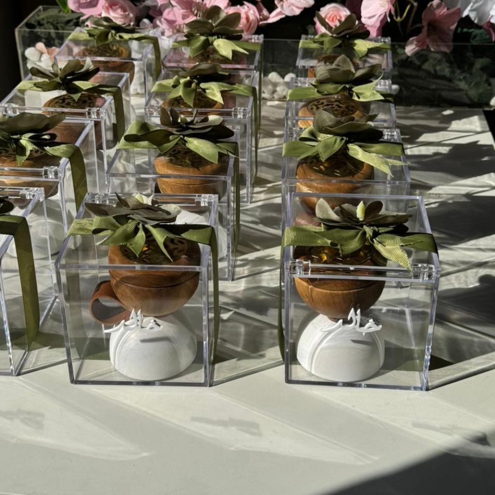 يُستخدم في مناسبات خاصة مثل حفلات الزفاف أو استقبال المواليد أو غيرها من الاحتفالات. التغليف يحمل علامة فيرساتشي ويتميز بلمسات زخرفية أنيقة مثل الأشرطة واللآلئ والبطاقات المخصصة باللغة العربية. الطابع العام للمنتج راقٍ، حيث يعتمد على ألوان ناعمة مثل البيج والأبيض، مما يجعله مناسبًا للمناسبات الفاخرة. تصميمه المتقن والعرض المميز يوحيان بالفخامة والتميز، ويُظهر أن هذه الهدايا مخصصة لإضفاء انطباع فريد ولمسة من الرقي.